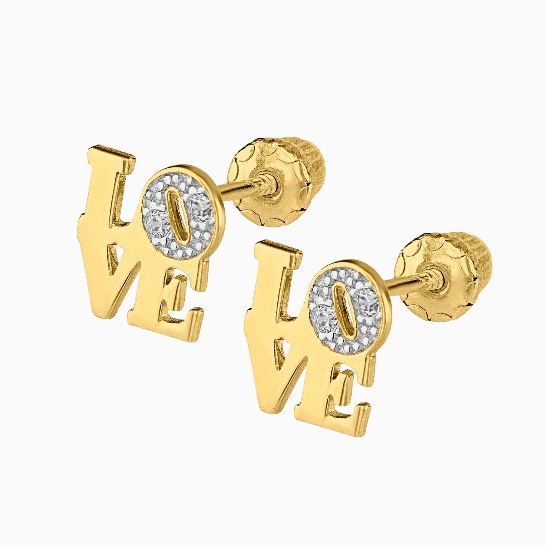 "Love" Stud Earrings + 2 Swiss Zirconia 0.8 mm, 14k Yellow Gold, Size 5.6 mm x 5.9 mm, Weight 1 gr + Case
